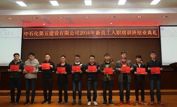 12月9日,中石化第五建设有限公司新员工入职培训班按计划圆满完成培训课程,结业典礼在公司东区综合培训中心举行。公司党委书记周兴中、副经理宋贤钧,中石化第五建设有限公司副总经理王建军、副总工程师兼兰州分公司经理周承胜、副总工程师兼国际业务部主任黄会安、副总政工师兼人力资源部主任石坤、兰州分公司党委书记庄志廷、五建公司相关部门和项目负责人、公司应用外语系负责人、任课教师及全体培训学员参加了典礼。典礼由公司副经理宋贤钧主持。