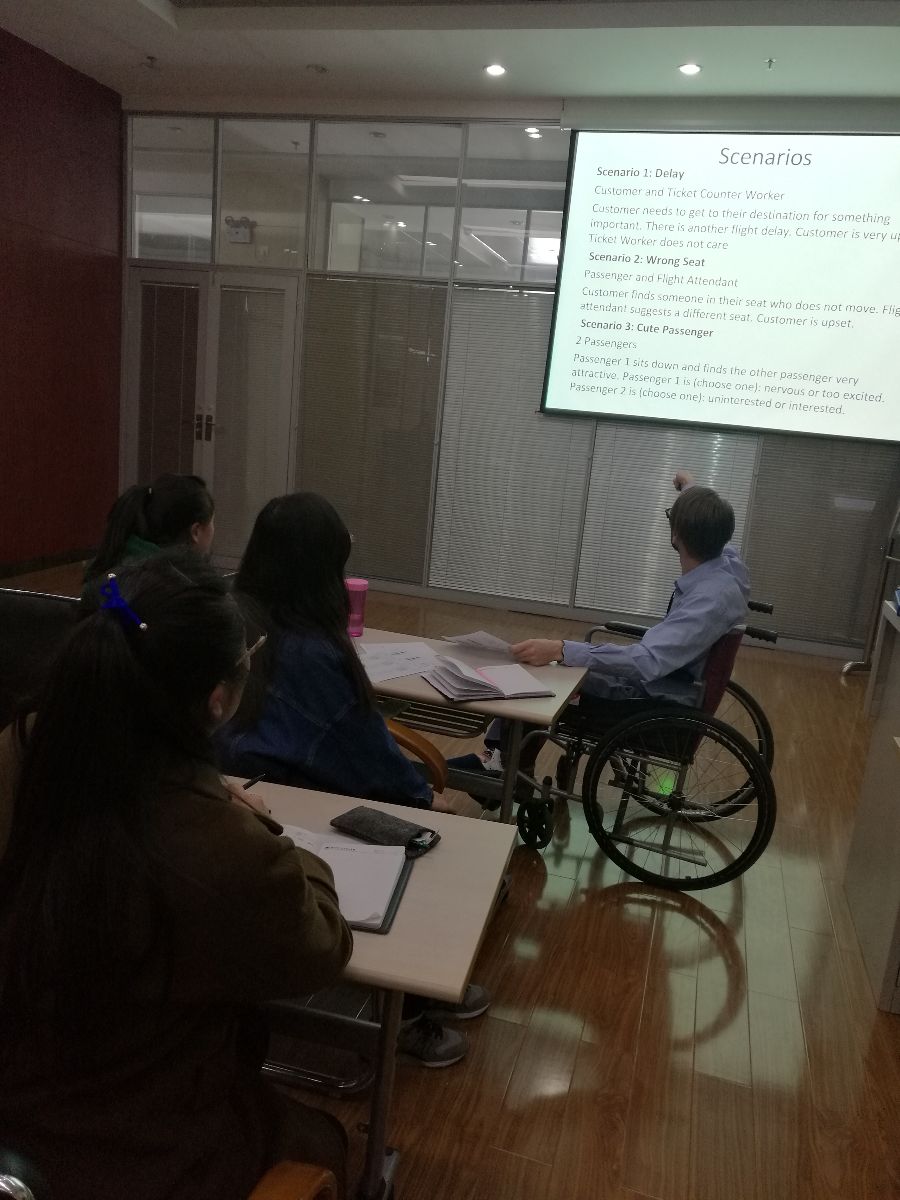本学期开学之际在公司任教的美中友好志愿者Garrett Smith不慎受伤无法行走,经医生诊断为左脚足跟骨折,医生建议卧床休养3个月,公司多次对其表示关切,建议他遵照医嘱安心养伤由其他教师代为授课。然而,出于对员工的喜爱和责任心及对教育事业的热忱,Garrett坚持带伤上课,在员工的搀扶帮助下忍痛站上讲台为员工上课。