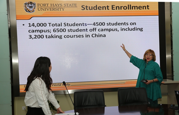 会上,周兴中对Elliott Cynthia Ann一行的到来表示热烈的欢迎。他简要介绍了公司的基本情况和对外合作交流、校企合作等情况。他说,公司十分重视国际合作与交流工作,希望公司以此次交流为开端,加强与福特海斯州立大学的交流和合作,开创两校全面合作的新前景。Elliott Cynthia Ann在对福特海斯大学概况及其近年来同各国院校合作办学情况进行简要介绍之后提出并详细介绍了未来两校的合作框架——交流生奖学金项目。该项目每学年设置总额为2000美元的奖学金并提供三种不同的研修模式供本校员工进行选择,分别为“2+2”模式(本校学习两年后赴福特海斯大学进修),“1+3”模式(本校学习一年后赴福特海斯大学进修三年后取得福特海斯大学学士学位)和“2+2+2” 模式(本校学习两年后赴福特海斯大学进修四年分别取得福特海斯大学学士学位和硕士学位),并且交流生还有机会进入福特海斯的各大石油公司进行实习。