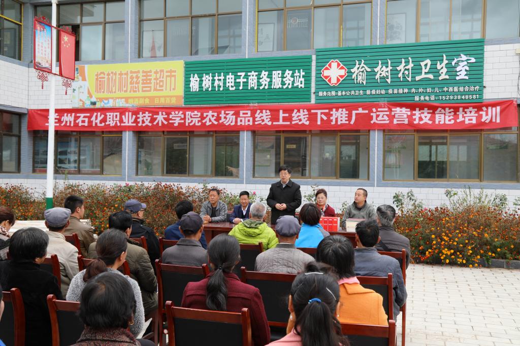 乡村的道路清新静谧,道路两旁秋景迷人,工作小组一边前进,一边规划着此行如何顺利完成工作任务。10月23日上午10时,工作小组的第一项任务——农产品线上线下推广运营技能培训活动如期在榆树村村委会举行,龙山镇党委书记陈金海参加了活动。在公司驻村第一书记的帮助下,榆树村和连柯村的近50名村民整齐的坐在榆树村村委会大院,深切感受到了兰州石化公司带给他们不一样的扶贫活动。蒲卫晖首先向村民介绍了培训活动的目的和主要内容,勉励村民积极响应党中央的扶贫政策,紧跟省市县镇各级政府组织的各项精准扶贫活动,希望村民们要发扬龙山人的的精神,能够认真学习技能,早日走上致富道路;要懂得感恩,共同努力,加强合作,共同过上幸福的日子。随后周任慧详细介绍了“兰博善诚行动”公益认领的办法和实施流程,并鼓励村民积极走劳动致富的路子,公司将从各种渠道致力于他们劳动成果的价值转化,公司电商教研室主任梁婵卓从农产品电商的特点、优劣势、线上线下渠道结合等方面介绍了农村电商技能技巧,公司电商骨干教师孙永建主任结合案例讲解了网络防骗办法和陷阱识别。活动期间采用一问一答的形式让村民记住关键信息,对表现积极的村民现场发放了纪念品。活动当场采集了村民可供销售的农村品种类和数量,1000斤土豆,500斤蜂蜜,10000斤苹果,300只土鸡等。一句句关怀的话、一件件实用的生活用品赢得了村民的阵阵掌声。
