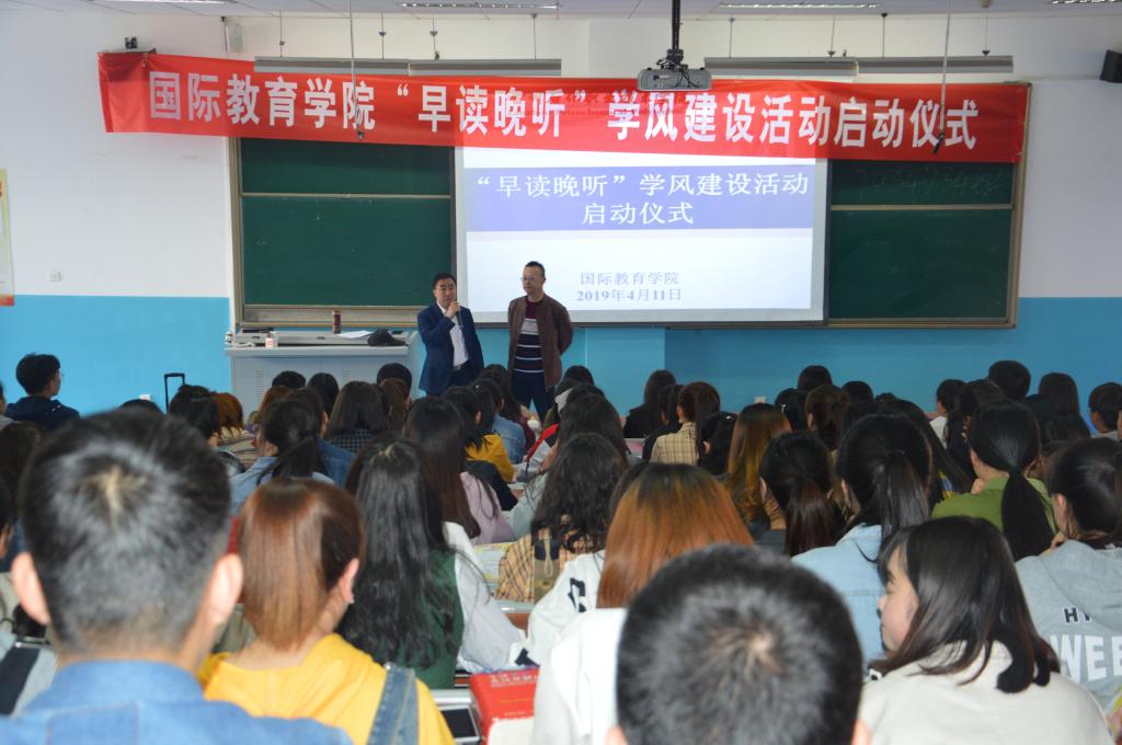 “早读晚听”英语学习活动是公司长期以来开展的特色学风建设活动,收到了良好的效果,为进一步促进公司学风建设,提高员工的英语应用能力、听说能力,近期,在校生中强化开展 “早读晚听”英语学习特色活动,把该活动打造为“老字号”特色活动和品牌,为此,世界杯8833300足球于4月11日在东区阶梯教室开展了“早读晚听”学风建设活动启动仪式,院负责人、辅导员、班主任及全体在校生参与,“黄河英语”创始人袁文老师应邀参加了此次活动。