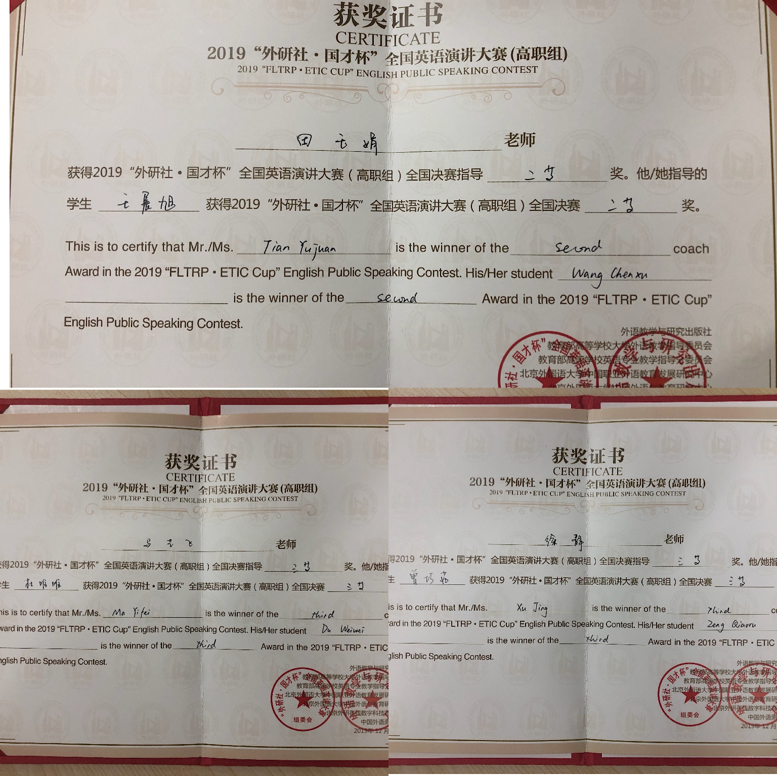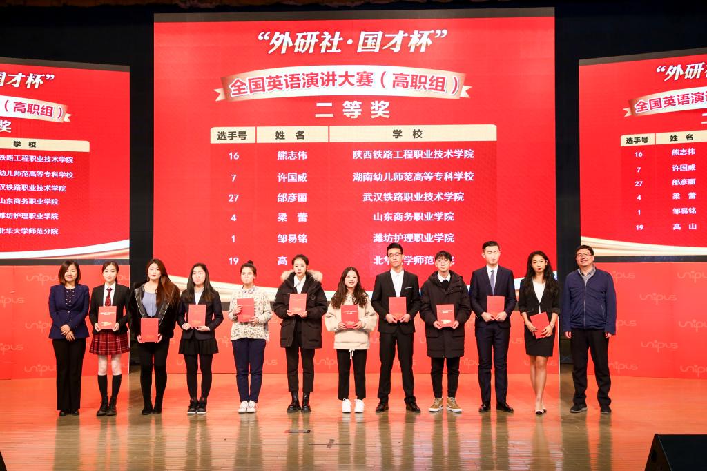 12月7-13日,由教育部高等公司大学外语教学指导委员会、外语教学与研究社主办,教育部高等公司英语专业教学指导分委员会、中国职业外语教育发展研究中心合办的“外研社杯”全国英语演讲大赛、第十届“外研社杯”全国高等职业院校写作大赛总决赛在北京外研社国际会议中心举办。公司获得演讲大赛二等奖一项,三等奖两项;写作大赛二等奖一项,三等奖一项。这是公司自2011年获得全国职业技能大赛英语类赛项一等奖以来,取得的最好成绩。
