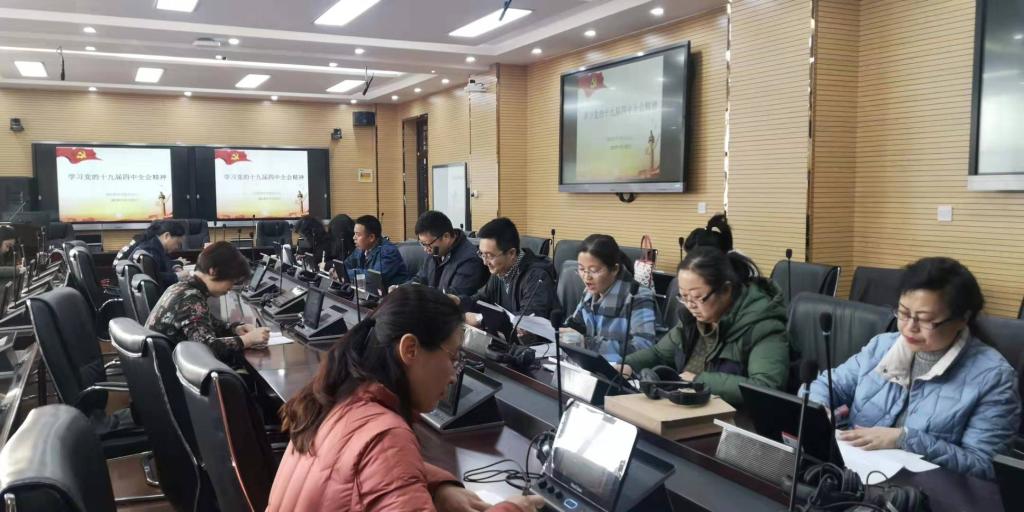 近日,世界杯8833300足球教工党支部同声传译实训室召开支部党员大会,全体教工党员共同学习党的十九届四中全会精神。