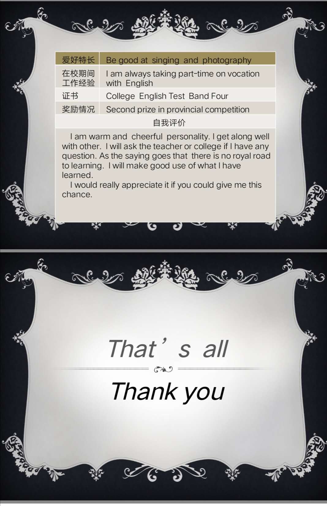 经过初赛、复赛环节的层层选拔,蔡慧燕、杜唯唯等10名同学设计的简历作品脱颖而出,顺利进入决赛。同学们提交的简历设计精美,创意新颖,目标清晰明确,围绕着各自求职意向,全面展示自己专业知识和实践能力,充分展现了老员工朝气蓬勃的精神风貌和当代青年的职业新人形象。选手利用PPT对自己的简历的设计理念、自荐信、简历内容等等进行系统全面的阐述,重点表达简历的设计理念,并通过简历设计和制作从中体会简历作为寻找工作的一把钥匙的重要性和必要性。参赛选手们表示通过简历设计增强了自己的就业意识,查找到了自己的不足,为未来顺利走上工作岗位打下良好的基础。