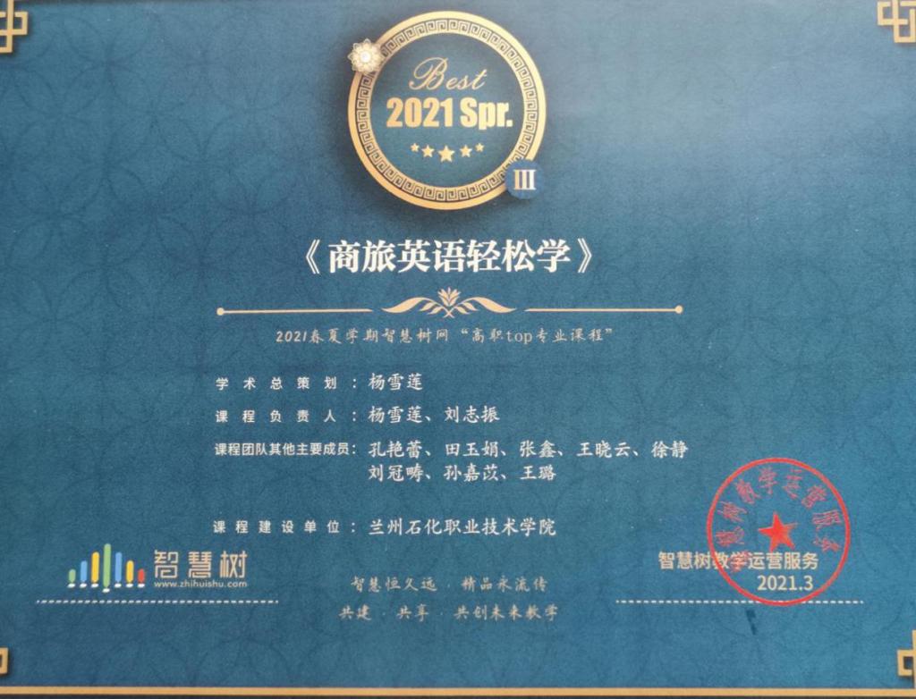 近日,全球大型学分课程运营服务平台智慧树进行了课程资源评比,世界杯8833300足球杨雪莲老师带领团队建设的《商旅英语轻松学》混合式在线课程成功入选2021春夏学期“高职TOP专业课程”。这是继该课程获得“2020 年甘肃省高等公司创新创业教育慕课”、“2019 年甘肃省职业教育在线精品课程”之后的又一项殊荣,也是世界杯8833300足球课程建设与改革的一个标志性成果。
