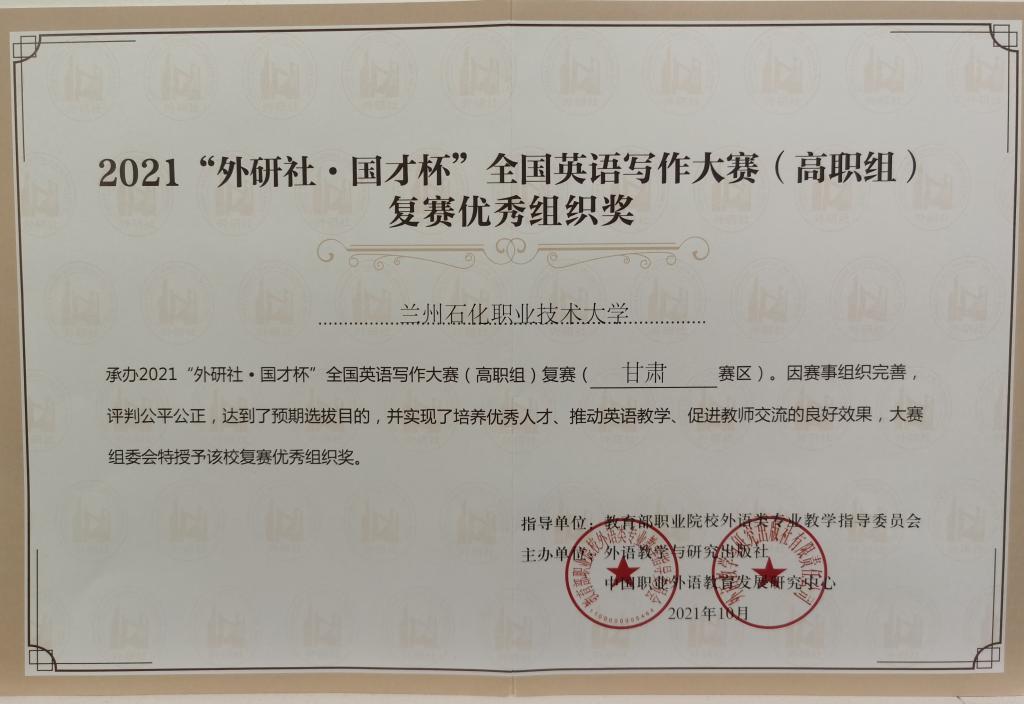 2021“外研社•国才杯”全国英语写作大赛(高职组)甘肃赛区复赛于10月31日在公司落下帷幕。比赛由教育部职业院校外语类专业教学指导委员会指导,外语教学与研究出版社和中国职业外语教育发展研究中心联合主办,甘肃省大学外语教学研究会协办,由公司负责承办。