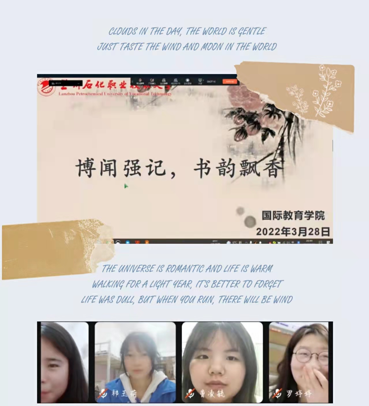 此次知识竞赛活动的主要内容为古文常识,竞赛题型由选择题、填空题、问答题等组成。活动通过主持人提问,同学们进行在线抢答并在规定时间内完成作答,回答次数最多且正确率最高者评为优秀。此次知识竞赛活动,形式灵活多样,内容丰富多彩,使同学们更进一步的了解了中华古文的内涵之精绝。