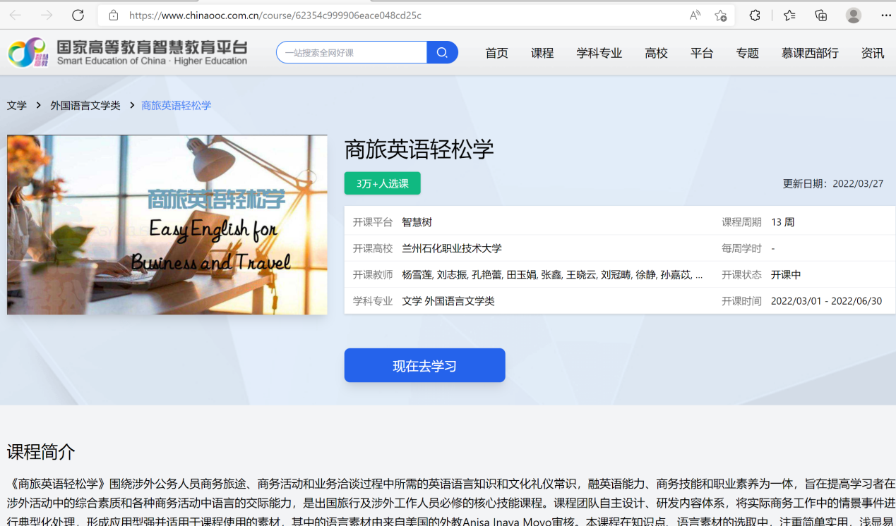 《商旅英语轻松学》上线以来曾获得智慧树网2021春夏学期“高职TOP专业课程”、“2020 年甘肃省高等公司创新创业教育慕课”、“2019 年甘肃省职业教育在线精品课程”等殊荣。该课程围绕涉外公务人员商务旅途、商务活动和业务洽谈过程中所需的英语语言知识和文化礼仪常识,融英语能力、商务技能和职业素养为一体。素材情景选取力求实用性和针对性,按照典型任务进行处理,新颖全面,实用性非常强。课程注重职场情境下的英语口语交际,注重语言应用,是出国旅行及涉外工作人员必修的核心技能课程。课程自2019年上线智慧树网以来,已累计运行7个学期,校内外选课人数3.40万次,服务全国本专科院校43余所,师生互动26.34万次。新冠疫情期间,为落实“停课不停教、停课不停学”的工作要求,为高校开展在线外语教学提供了全方位支撑。