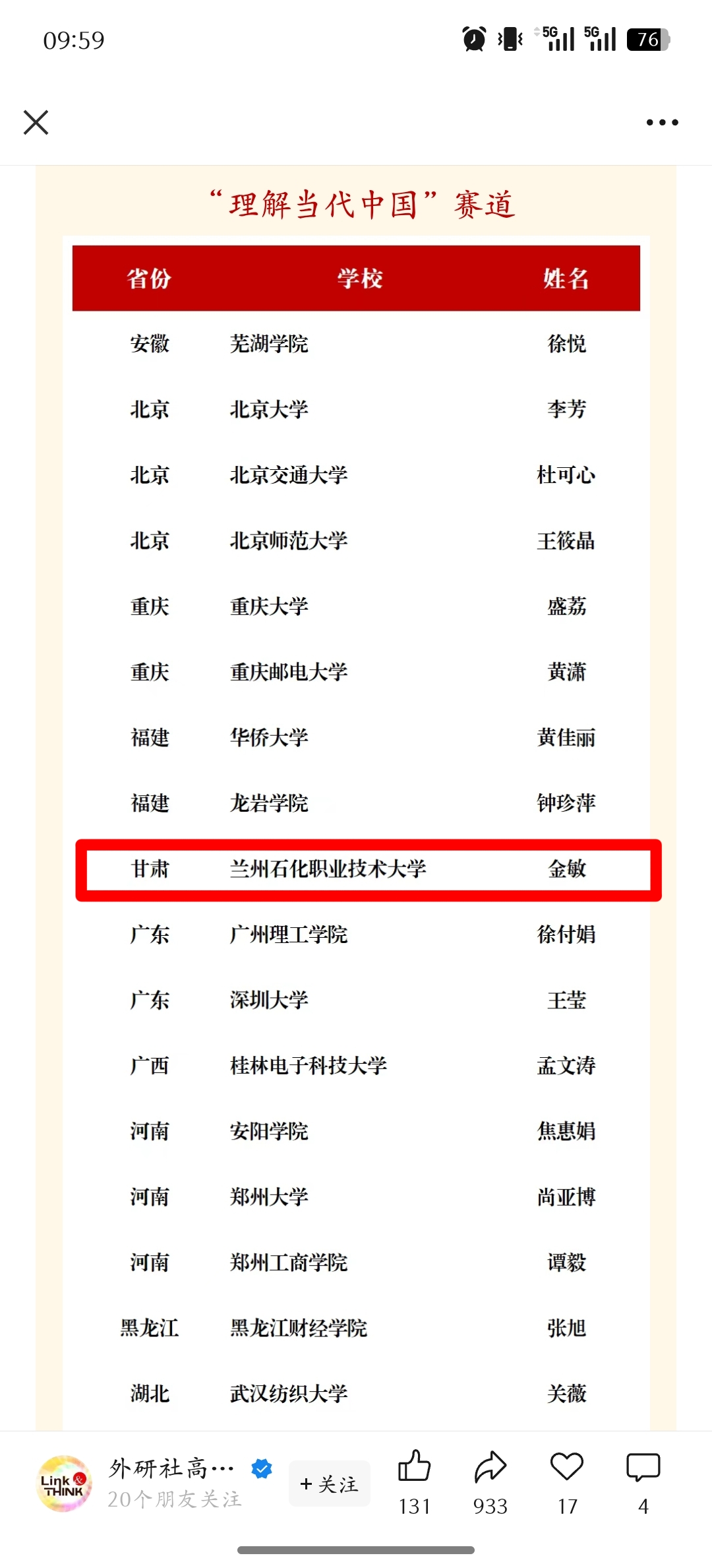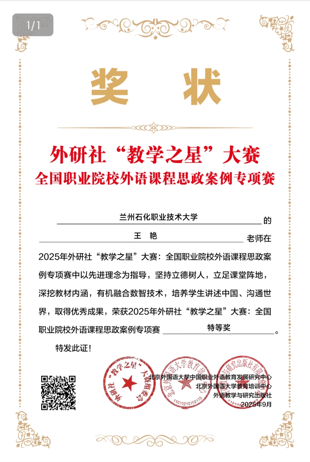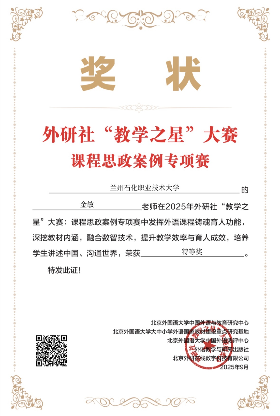 本次大赛设置多赛道,各赛道竞争激烈。在“理解当代中国”赛道(本科组),全国仅评选出40名特等奖,经过与北京大学、西安外国语大学等多所知名本科院校激烈角逐,金敏老师成为甘肃地区唯一获此殊荣的教师。她以《理解当代中国 大学英语综合教程 1》为依托,围绕“文化遗产:传统与创新”主题,运用5E教学法,搭建“金字塔层级”教学框架,并融入数智技术,实现文化自信、工匠精神、国际视野等思政目标与英语语言教学的深度融合。