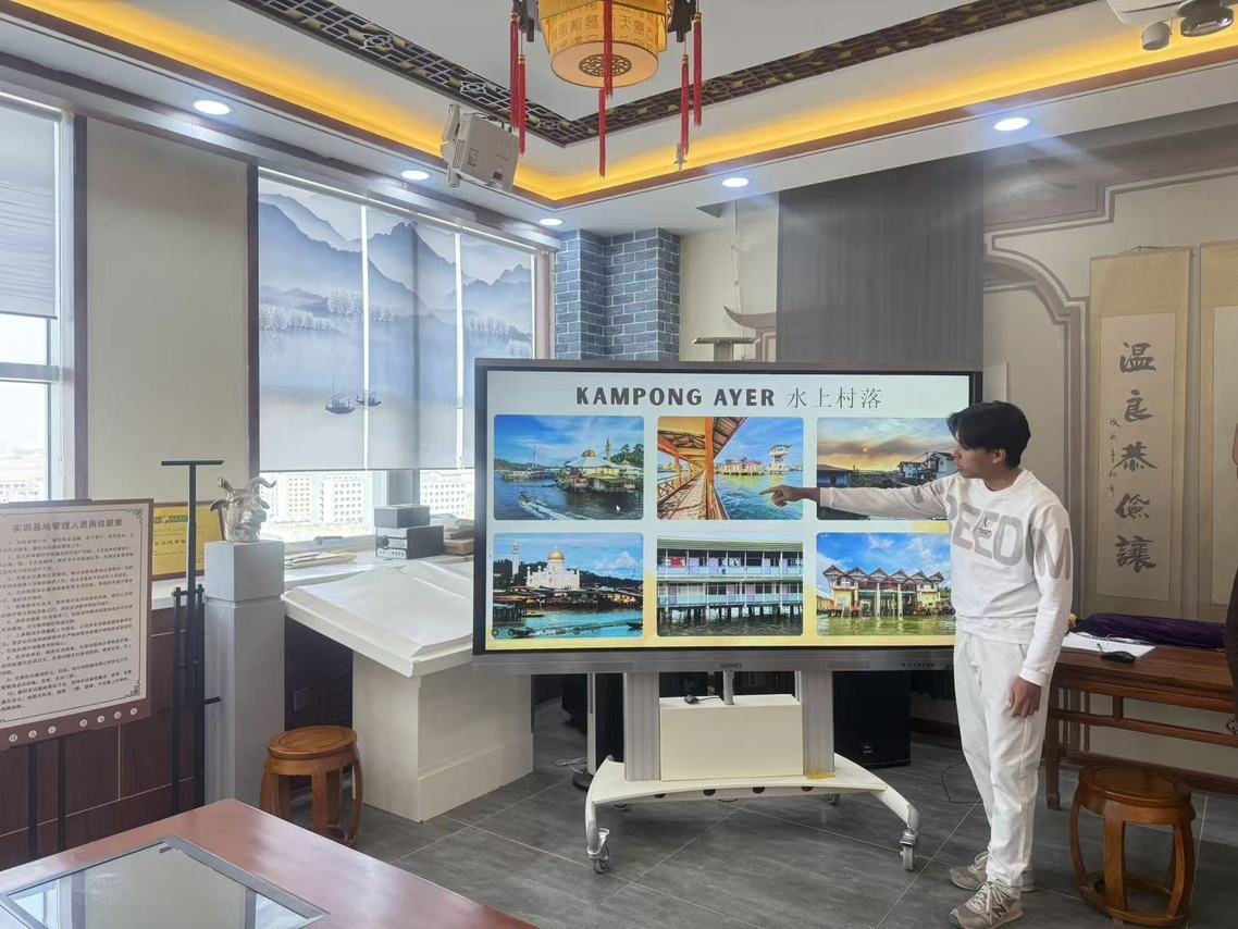 活动伊始,公司指导教师介绍了此次活动的背景与意义,强调开展员工文化交流活动,既是对两国友好关系的传承,也是推动文明互鉴、培育跨文化沟通能力的重要举措。随后,活动进入核心分享环节,文莱职工与中国员工依次化身“文化导游”,带来了一场跨越山海的文化盛宴。在文莱文化分享环节,10名文莱员工组成宣讲团,分板块详细介绍了本国的自然环境与风土人情,让在场中国员工全方位领略了这座南洋岛国的独特魅力。在自然环境介绍中,职工们重点分享了甘邦阿逸水上村落的风貌,讲解了这座世界上最大水上居住区的建筑特色与居民的生活习俗,让大家对文莱“水陆相依”的居住文化有了直观认知。在风土人情展示中,文莱员工现场演示了传统服饰Baju Melayu和Hijab的穿戴礼仪,细致讲解了服饰背后的文化内涵;同时,文莱员工还教中国员工文莱传统问候礼仪,互动间拉近了彼此距离。